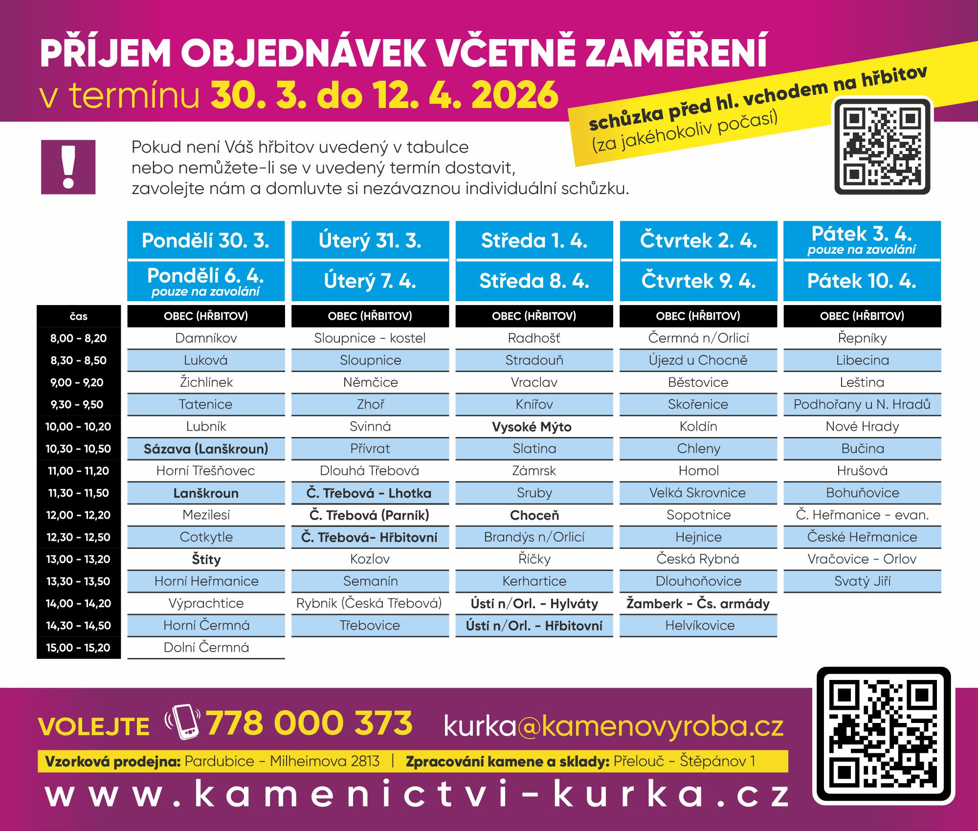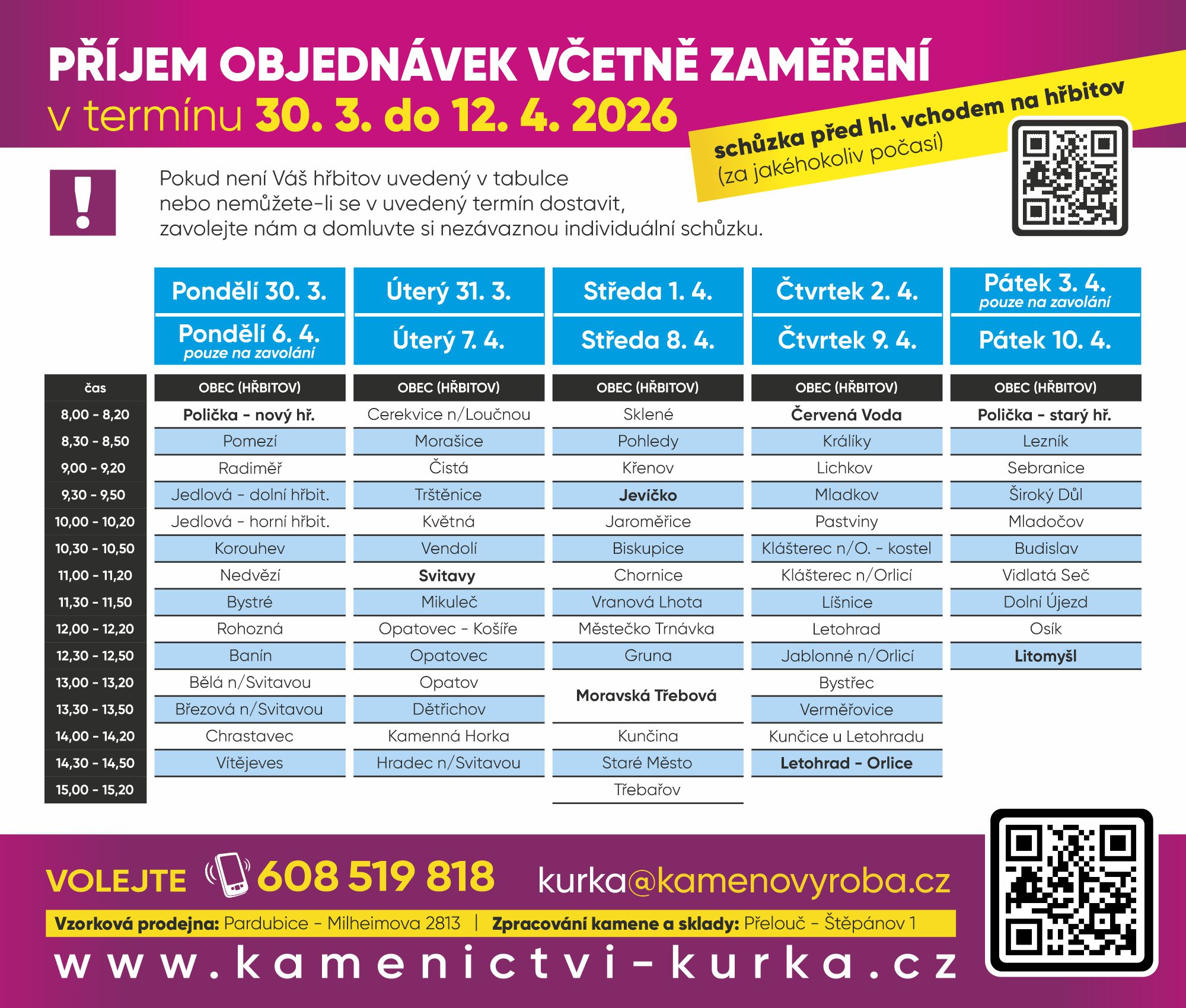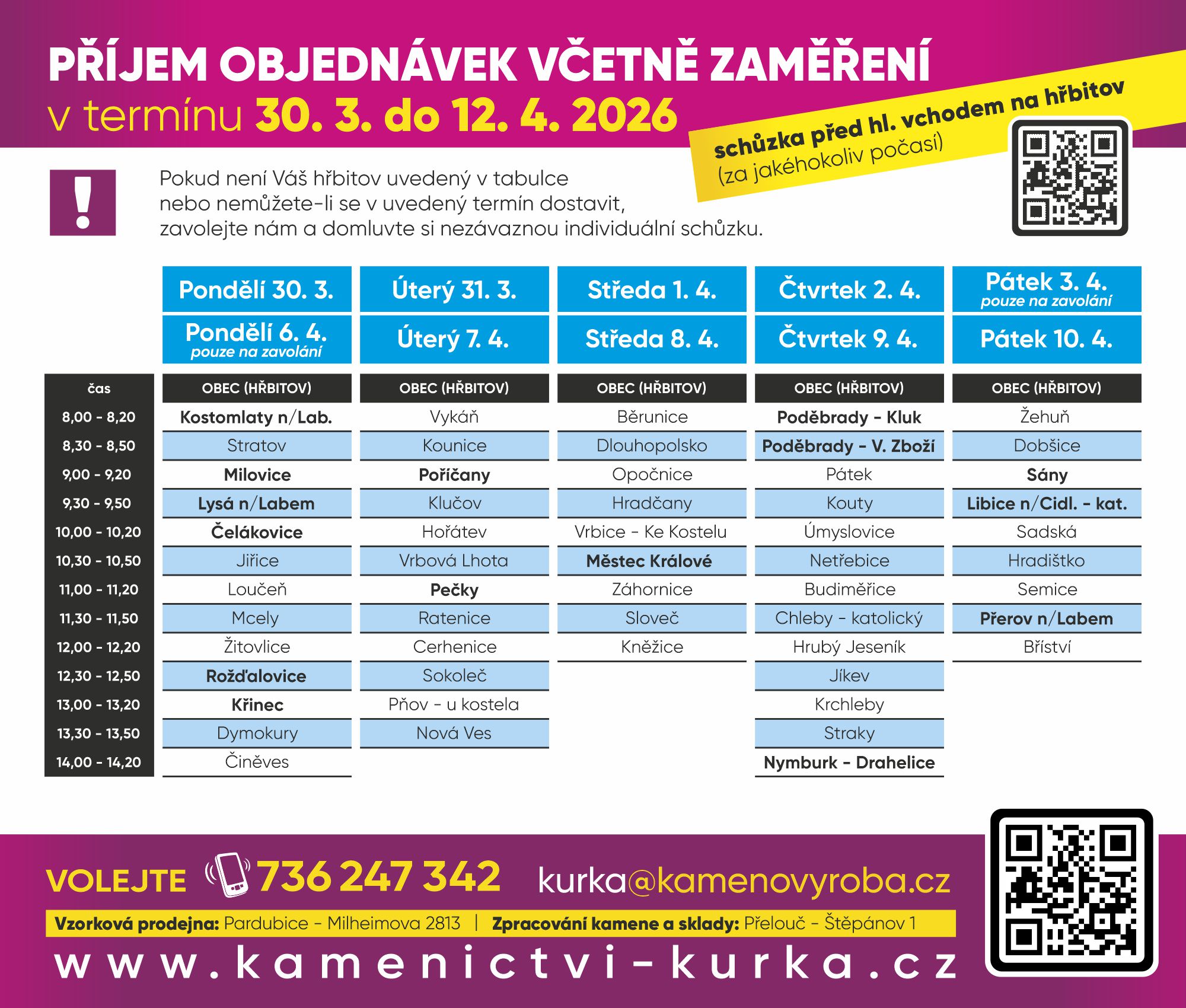 Nezávazná schůzka a příjem objednávek na hřbitovech v okrese Nymburk, Jičín, Svitavy a Ústí nad Orlicí viz níže, dle termínů uvedených v tabulkách.